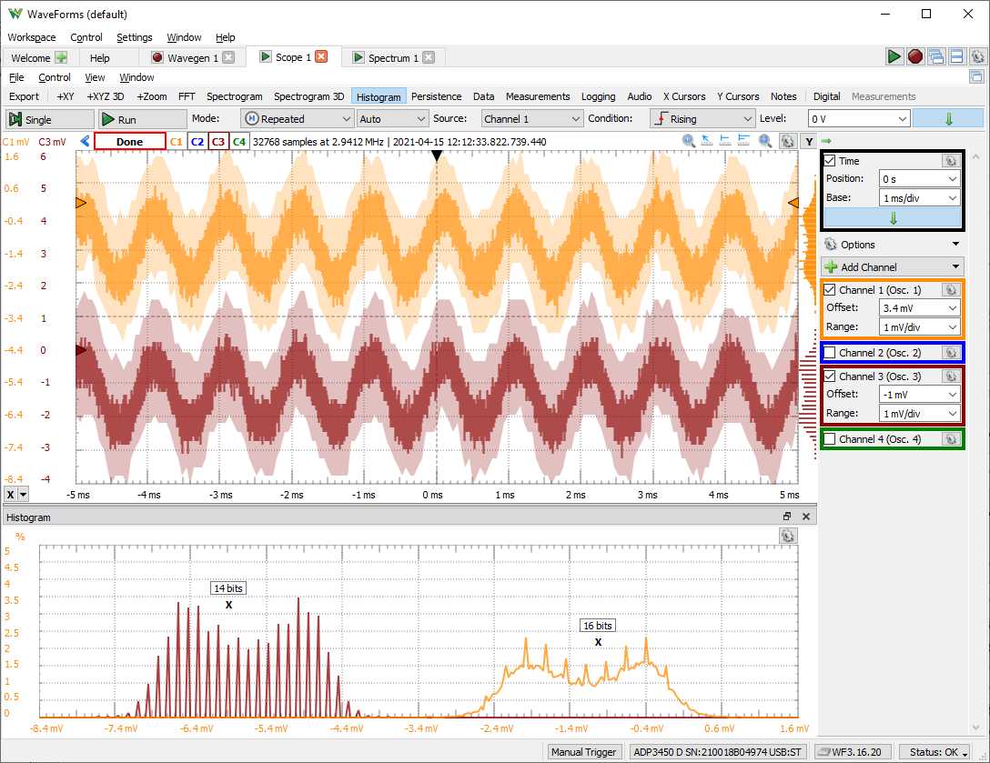 其中一个主要差异,并且可能选择一个设备超过另一个设备的原因之一,是一些核心示波器规范的差异。虽然波形中的示波器仪器只是设备上可用的众多乐器之一,但它是最多关于功能的仪器之一。ADP5250是我们提供迄今为止的最高样品速率设备,提供1GS / S采样率和100 MHz带宽。As a tradeoff, this device has 8-bit resolution, so if resolution is the most important characteristic you’re looking for in a test system, the Analog Discovery Pro 3000 series is the better choice at 14-bits of resolution (which can be software enhanced to 16 bits) and a maximum sample rate of 125 MS/s (or 0.5GS/s for periodic signals) and 55 MHz bandwidth.