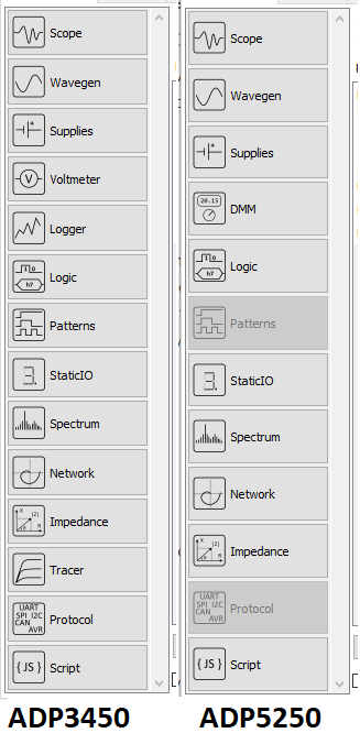 ADP5250引入了一种全新的仪器,添加了专用输入可编程DMM。在共享其他模拟和数字输入和输出的仪器方面,ADP5250还支持示波器、波形发生器、电源、逻辑分析仪、频谱分析仪、网络分析仪和阻抗分析仪仪器。ADP3250没有DMM,但增加了电压表、静态I/O、数据记录器、图形发生器和协议分析仪等仪器。ADP3450增加了曲线描记仪。三种设备都有电源仪表。