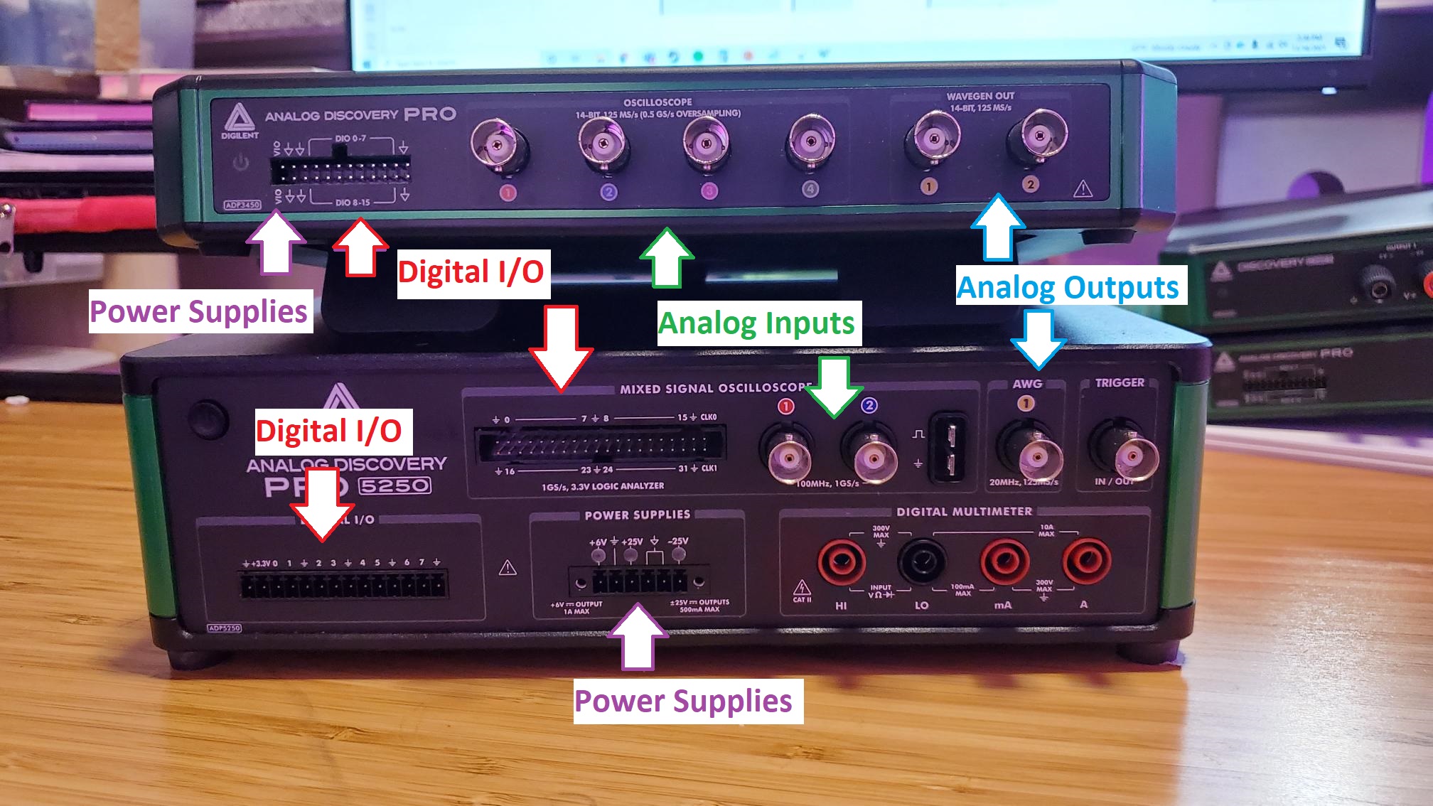 另一个关键规格差异是频道的数量。如果您需要4个示波器频道,ADP3450就是要走的方式,但如果您对两个通道很好,另一个比较更为重要,而且ADP3250或ADP5250可能是更好的选择。在查看模拟和数字频道的总数时,ADP5250在大约43个通道中进入。但是,ADP3250具有束的最大模拟输入通道。查看输入和输出,ADP5250具有32个数字输入,8个数字输出,2个模拟输入,一个模拟输出和3个电源输出,而ADP3250有16个数字输入和输出,4个模拟输入,两个模拟输出和一个电源输出。ADP3250具有比ADP3450更少的模拟输入。ADP5250还可以添加与可编程DMM相关联的通道。
