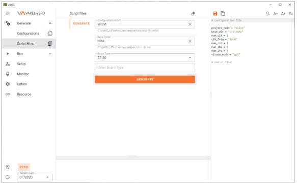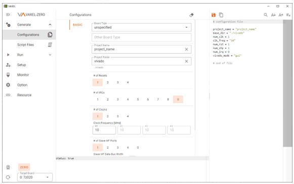 - 轻松准备和配置Zynq处理器,如时钟和总线:虽然所有工程师希望专注于使用FPGA的RTL设计的验证和测试,但通常意味着它们必须分配令人沮丧的时间来准备和配置船上FPGA上的处理器,例如时钟和总线。如下所示,VAXEL ZERO提供了一种工具,它允许您通过填写GUI的一些参数来完成Zynq处理器配置的工具。