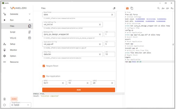 - 您的逻辑控制程序和应用程序(C代码)将自动上传到其中一个ARM处理器:除了将C应用程序上传到Zynq板上的一个ARM处理器之外,Vaxel Zax Zaxel还提供了一个很好的GUI,允许您从Windows PC操作应用程序,而只是发送参数。