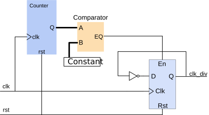 让我们假设预先定义的数字是3,时钟分配器(clk_div)的输出被初始化为0。在计数器的输出等于预先定义的常数3之前需要3个时钟周期。当它达到3时,时钟分压器(clk_div)的输出变为1,计数器自己复位。在计数器的输出等于预先定义的常数3之前又需要三个周期。当它再次达到3时,clk_div返回0。因此,在clk_div返回1并再次返回0之前需要6个时钟周期。因此,clk_div的频率是原始clk频率的六分之一。