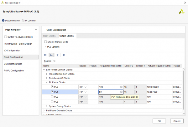 PS可以生成多个时钟,然后提供给FPGA结构。这些时钟被称为PL时钟,可以在时钟配置页签。它们位于低功率域时钟→PL织物时钟下拉。它们可以通过复选框启用(或禁用),用来驱动时钟的硬件源可以更改,频率可以修改。