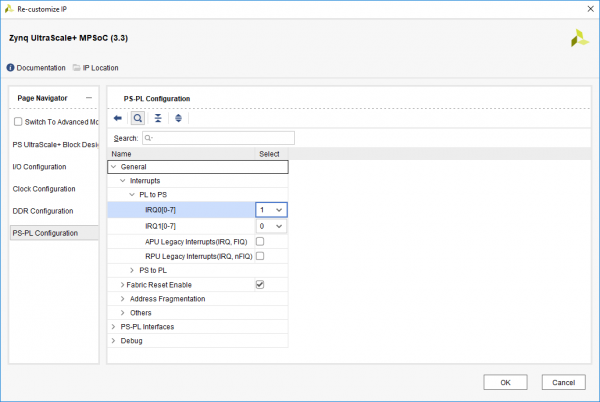 UltraScale设备也可以使用FPGA结构中产生的中断来触发处理系统中的中断。可以在配置向导中更改与中断相关的设置PS-PL配置选项卡。这些中断可以使用IRQ0端口,可以在一般→中断→PL对PS下拉。要启用该端口,IRQ0下拉菜单应该设置为“1”。