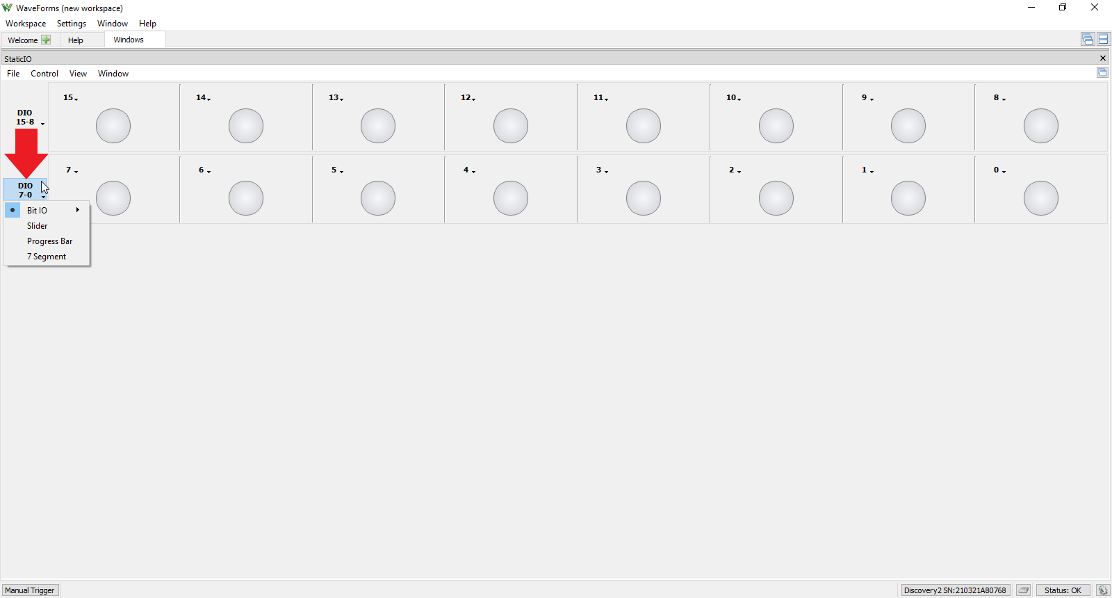一旦Welcome页面加载,在窗口左侧的仪表面板中,单击StaticIO按钮打开静态I / O乐器。