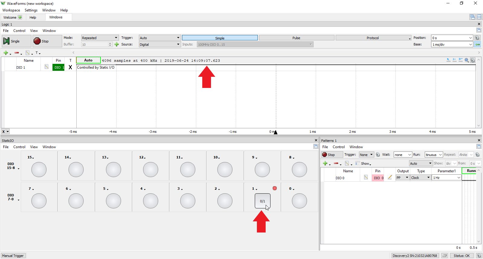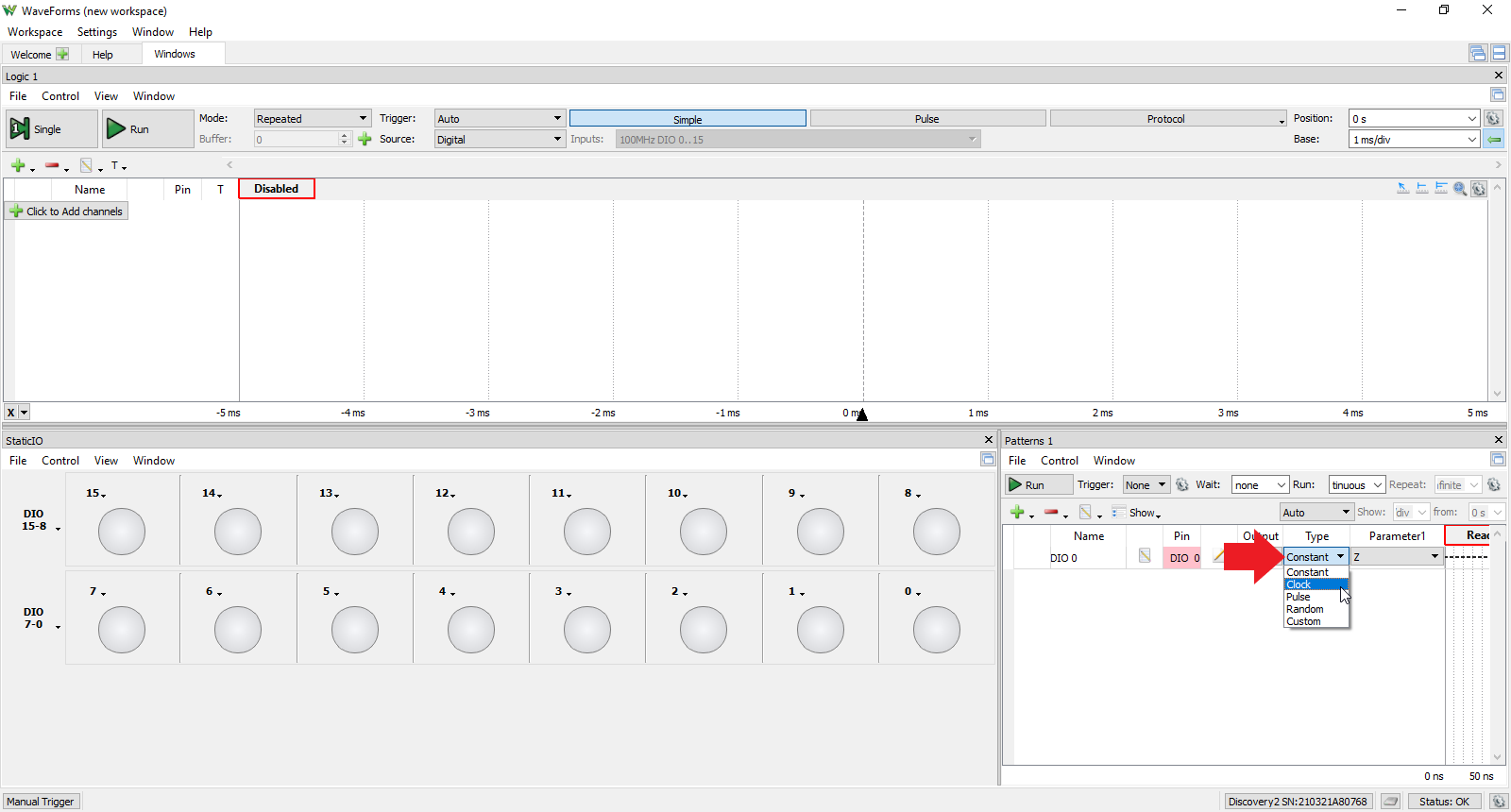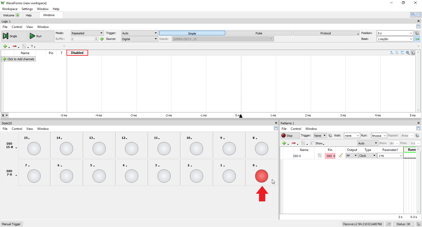 本节将介绍如何设置StaticIO仪表显示和与数字I/O端口及其逻辑电平交互。的逻辑分析仪将用于查看虚拟按钮的输出状态。的模式发生器将会被用来眨眼一个虚拟引领.